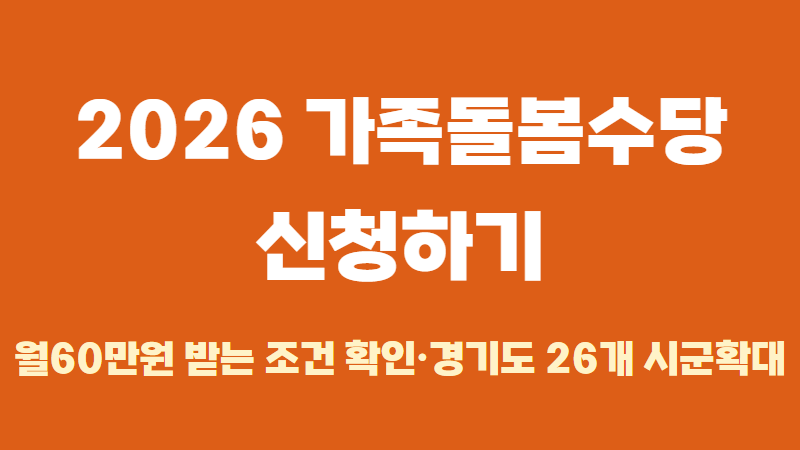 조부모나 친인척이 아이를 돌보는 가정에 월 최대 60만 원을 지원하는 가족돌봄수당이 2026년부터 경기도 26개 시군으로 대폭 확대됩니다. 지역별로 신청 시기와 운영 방식이 다르고, 중위소득 150% 이하 등 세부 조건이 중요해 사전에 정확한 정보 확인이 필요합니다. 이 글에서는 2026 가족돌봄수당 신청 방법과 지원 조건을 핵심만 정리해드립니다.